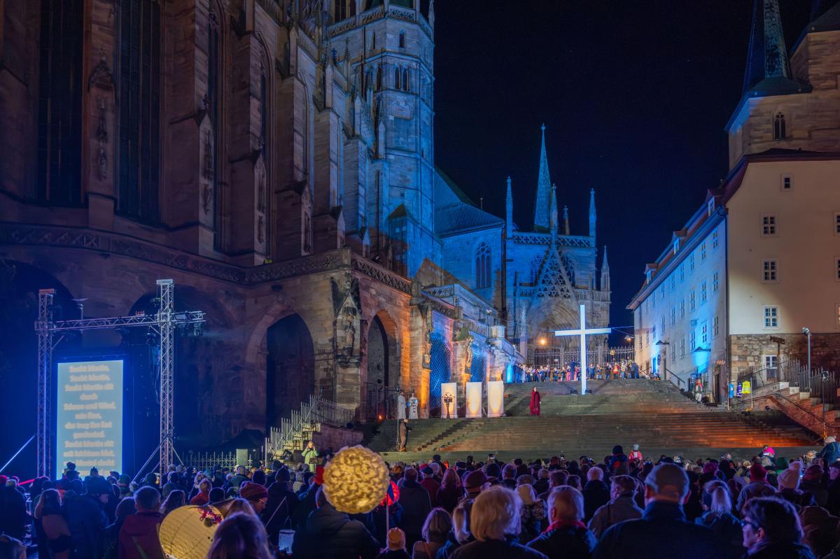 Pünktlich um 18 Uhr begann der ökumenische Gottesdienst auf den Domstufen. Neben den bekannten Liedern und dem Auftritt der beiden berühmten Martins - Martin Luther und Martin von Tours - gab es natürlich auch wieder das gemeinsame Laterneschwenken auf dem dunklen Domplatz. Viele waren gekommen, um sich in der besonderen Atmosphäre des dunkeln Novemberabens am Leuchten der Laternen, der Musik und den Spielszenen zu erfreuen. „Geteiltes Leid ist halbes Leid“ lautete das Thema des Gottesdienstes in diesem Jahr, in Anspielung auf die vielen Krisen in der Welt. In dem Gottesdienst traten Menschen auf, die von ihren Erfahrungen beim Helfen und Leid-Tragen erzählen: ein Schülersanitäter, eine Mitarbeiterin aus dem Team der Erfurter Notfallseelsorger*innen sowie eine Person, die sich bei der Erfurter Bahnhofsmission engagiert.